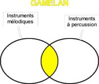 De quels types sont les instruments d'un gamelan ? S'agit-il d'instruments à percussion ou d'instruments mélodiques ? Un instrument est dit mélodique quand il peut jouer plusieurs notes. Un triangle ou un tambour dans un orchestre symphonique ne sont donc pas des instruments mélodiques. Parce que ce sont des instruments à percussion ? Non, puisqu'il existe des instruments à la fois mélodiques et à percussion, comme le xylophone et le vibraphone. |
